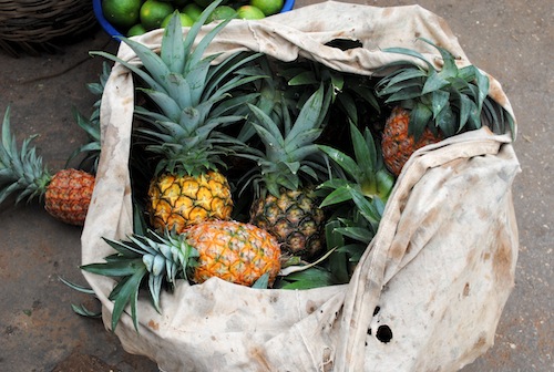 So we plunged deeper now into the food market, colliding into a stimulating parade of grains, tomatoes, corn, garlic, rows of fruits and vegetables, fish and meats, preparation stands, beans, and yams. It was a smorgasbord of produce and a sensory overload but incredibly inspiring from a design point of view in terms of shapes, colors and textures. Fruits I’ve never seen before with names I can’t pronounce are juxtaposed next to the usual suspects of pineapples, mangoes, bananas, avocados, tomatoes, garlic, peppers, lemons, beans, limes and carrots. We move on and weave through craft stands, toy stands, hardware stands, used clothing stands, grain stands, tchouk tchouk stands, all amidst people milling about, chatting, smiling, heckling, shouting, running, cooking, sleeping, laughing, singing and dancing. We finally reach the end of the maze, and even though we could probably spend an entire day meandering through the market, it was time to go up to Mt. Kuma to search for colored vegetable dyes made from local plants, fruits and vegetables.